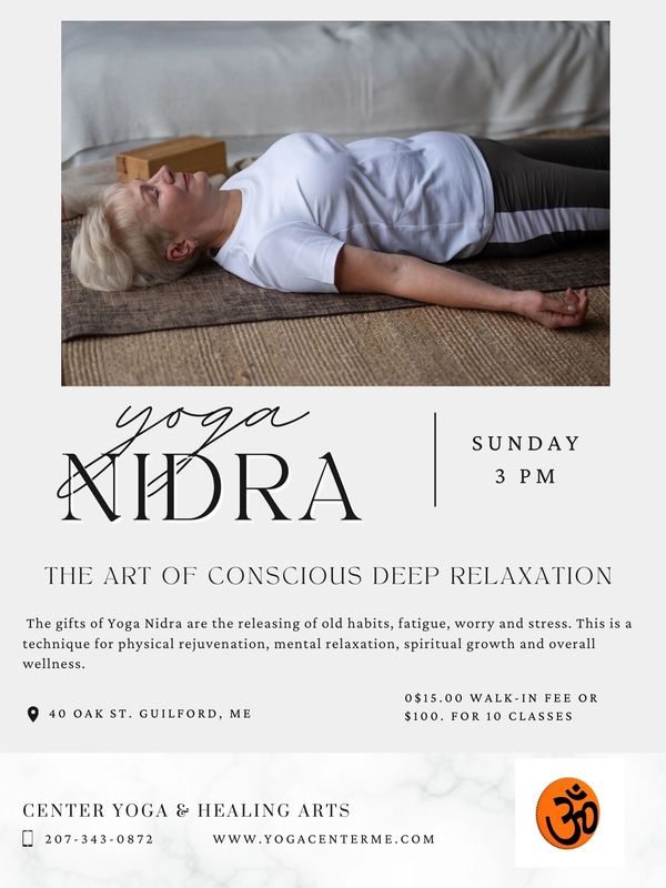 The practice is done while lying down on one's back with eyes closed and the body made completely comfortable. It involves deep relaxation with inner awareness while the instructor leads a guided session with her voice. The guide uses auto-suggestion cues, visualization and affirmation to create an environment in which healing can occur. A few of the benefits now being confirmed by the medical field are increased immune function, digestive function and better sleep. The gifts of Yoga Nidra are the releasing of old habits, fatigue, worry and stress. This is a technique for physical rejuvenation, mental relaxation, spiritual growth and overall wellness. The secret of Yoga Nidra, and to better health, lie in its ability to relieve tension and stress at its root and restore a balanced state of mind and a deeply rested body.